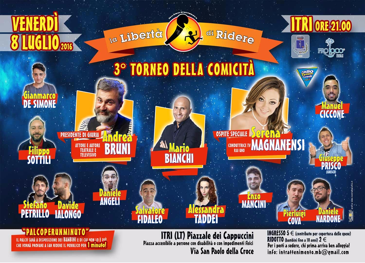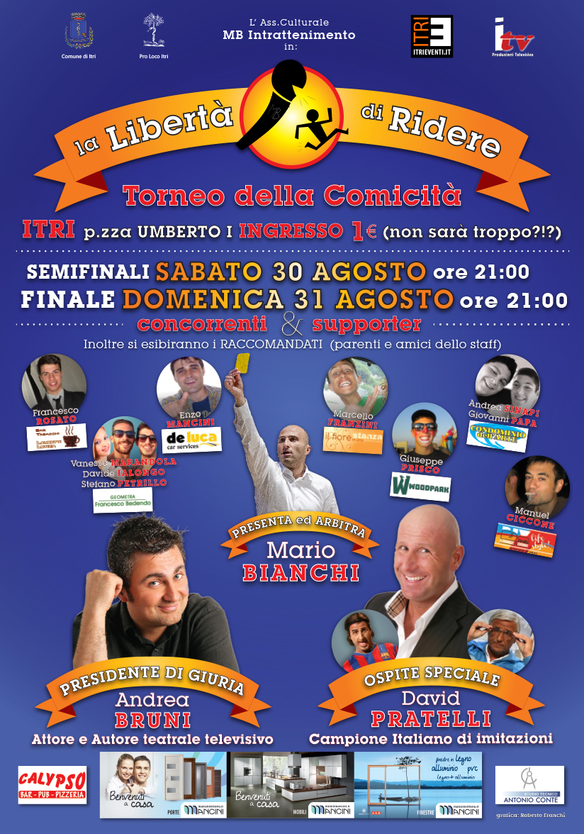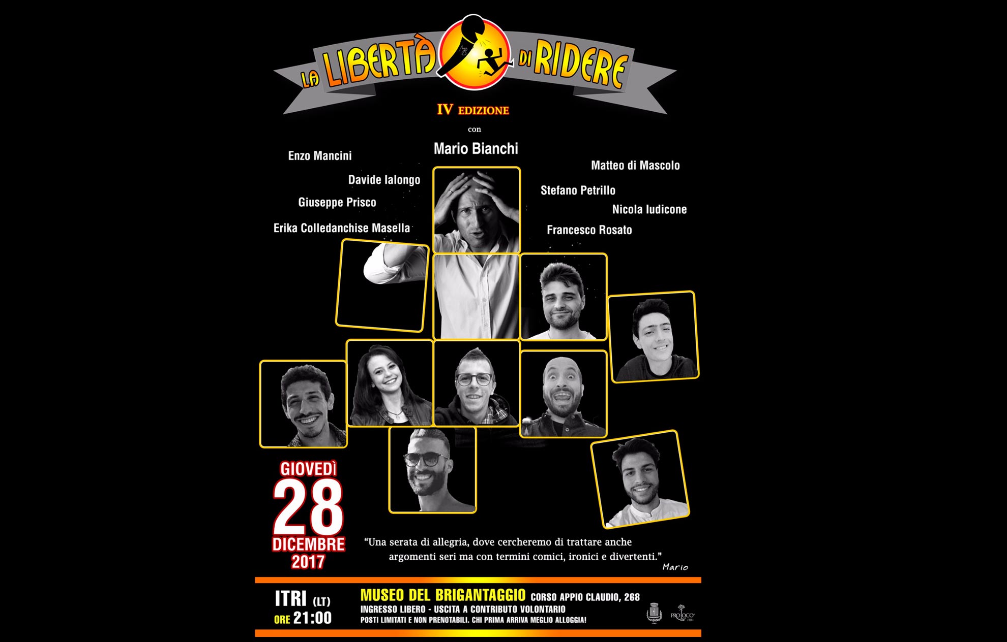 Il Torneo della comicità “La libertà di ridere” è uno spettacolo ideato da Mario con lo scopo di valorizzare le capacità espressive e le tendenze alla comicità degli aspiranti artisti di tutte le età e delle persone inconsapevoli delle proprie abilità, promuovendo nel territorio pontino l’arte e la valorizzazione della cultura artistica e dell’intrattenimento. Lo show è un’interazione tra aspiranti comici, artisti, autori e graditi ospiti, tutti uniti dal solo obiettivo di divertirsi rallegrando il pubblico.